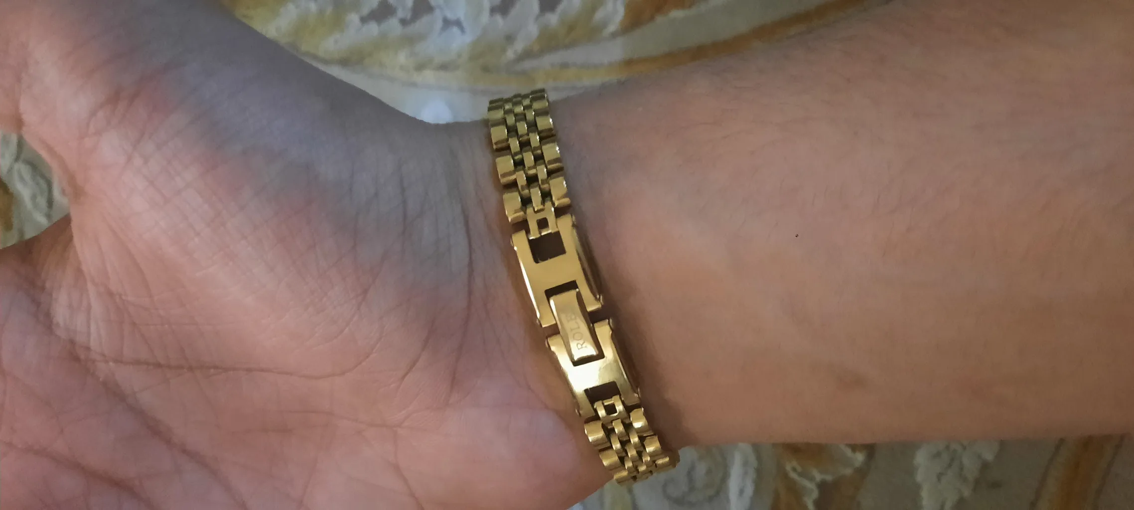 خب انتظار میره جنس اصلی که طلا هست، این استیل رنگ ثابت باشه که نیست، بازم استیل نباشه اشکال نداره لااقل طرحش یکی باشه، رنگش طلایی باشه و لااقل برا یکی دو ساعت اول معلوم نباشه که بدله...
