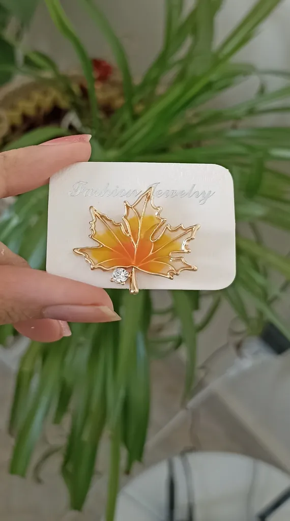 خییلی زیبا و ظریفه، به محض این که اولیش به دستم رسید، اون یکی رنگش رو هم سفارش دادم. لبه های تیز نداره که پارچه رو نخ کش کنه. من از این مدل گل سینه های سوزنی بیشتر برای روسری استفاده می کنم، چون دوست دارم کاملا فیکس بشه و روسریم به مرور آزاد نشه. ممکنه برگش بچرخه و رو به پایین قرار بگیره اما باز هم برای من زیباییش رو داره. جای یه نقطه کوچولو توی روسری باقی می مونه چون یه مقدار میله ضخیمه، اما برای من مهم نیست چون اون قسمت از روسری هیچ وقت جلوم یا روی سرم قرار نمی گیره که پیدا شه. و البته تو جنسایی که خیلی بافت روسری متراکم نیست هم اصلا خودش رو نشون نمی ده. احتمالا برای یقه و کیف خودش رو نشون بده و اگر همیشه به اون قسمت از یقه گل سینه نمی زنید، اون سوراخ ریز باقی مونده ناراحتتون می کنه. توی یکی از عکس ها فاصله بین برگ و گیره ش مشخصه؛ اگر به لباس یا مثلا کیفی که ضخامتش کم نیست وصل کنیم بعید می دونم بچرخه. در کل خیلی زیبا و خوش رنگه من از خریدم خیلی راضی هستم