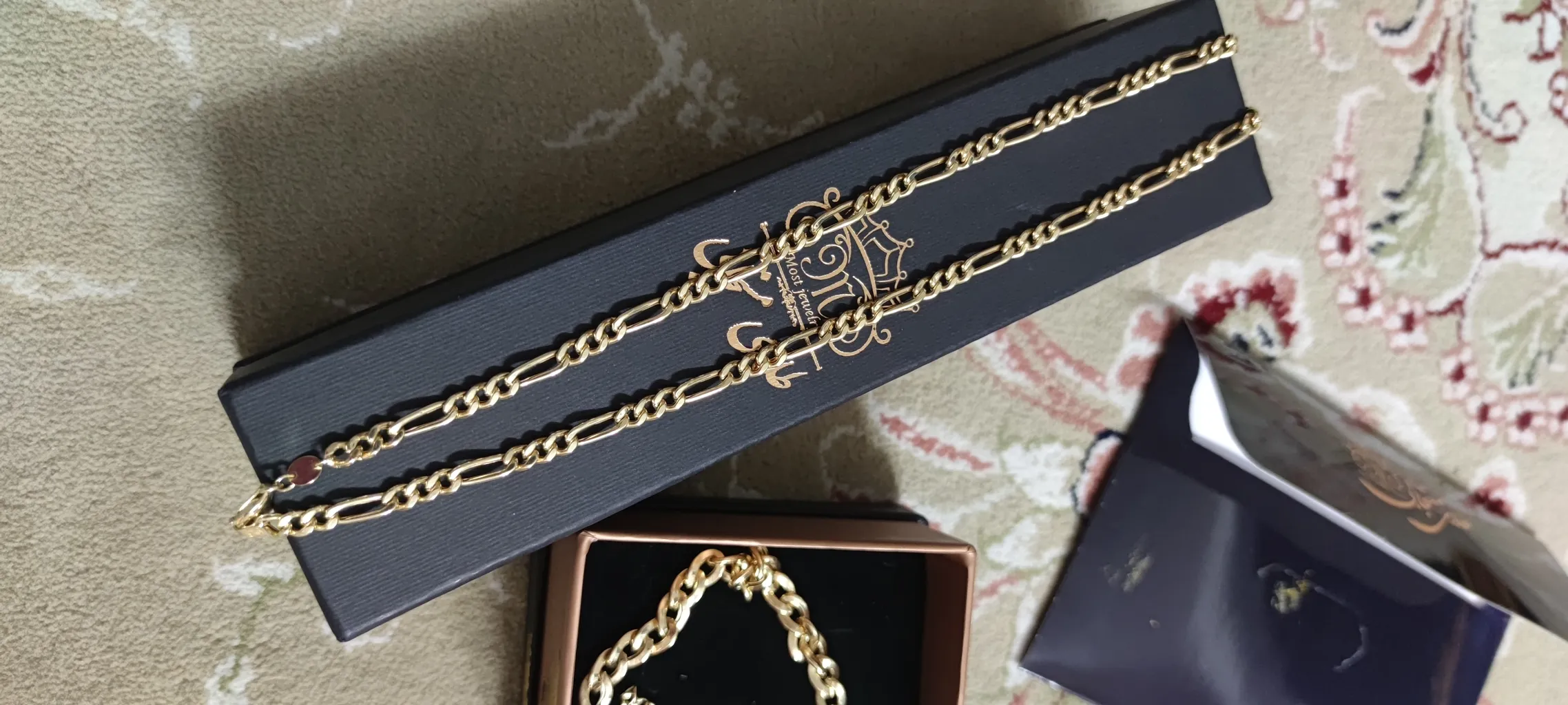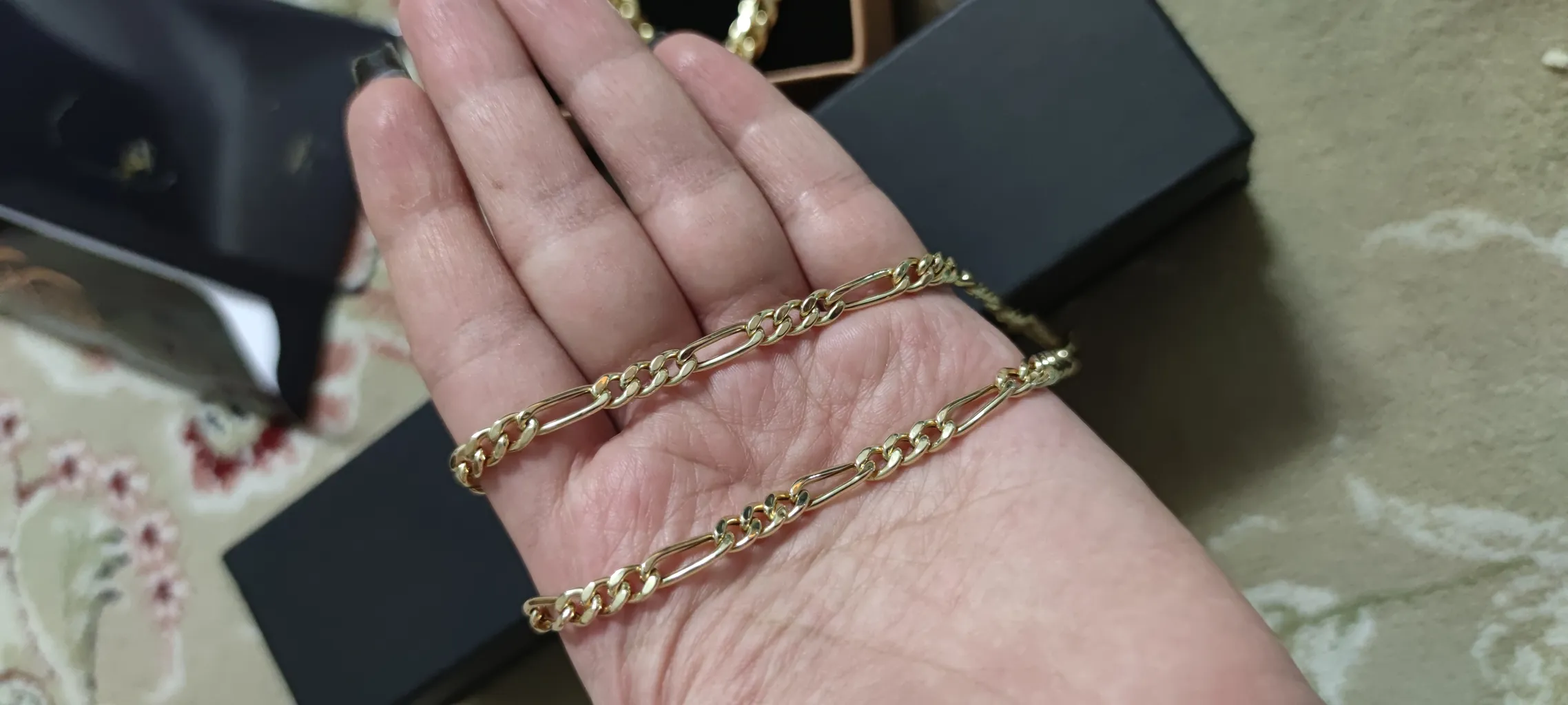 - ⬤ زنجیر طلا فیگارو : زنجیرهای فیگارو به دلیل طراحی خاص و ترکیب حلقههای بزرگ و کوچک، جذابیت خاصی دارند. خریداران از زیبایی و استحکام این زنجیرها ابراز رضایت کردهاند و آنها را مناسب برای استفاده در مناسبتهای خاص میدانند. اما برخی از خریداران به قیمت بالای این زنجیرها و همچنین قفلهای ضعیف آنها اشاره کردهاند. این زنجیرها به دلیل طراحی خاص خود، میتوانند به عنوان یک انتخاب شیک و مدرن در نظر گرفته شوند.