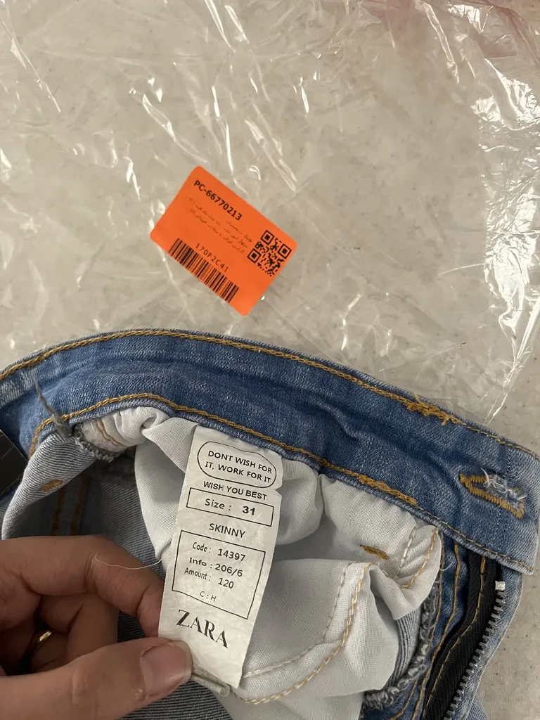من سایز ۳۰ سفارش دادم اما سایز خود شلوار ۳۱ نوشته شده، با این حال اندازم هست، مدلشم توی دیجی کالا نوشته شده مام فیت اما لیبل خود شلوار نوشته اسکینی، قد هم ۹۰ هست، رنگش ابی روشن هست خوشرنگه مثل عکس آخر و کمی سنگ شور داره، برند زارا هست، اسکن کردم و اصل بود، در کل با تخفیف ۳۵۰ خریدم ک بنظرم خیلی می ارزه و واقعا قیمتش مناسبه