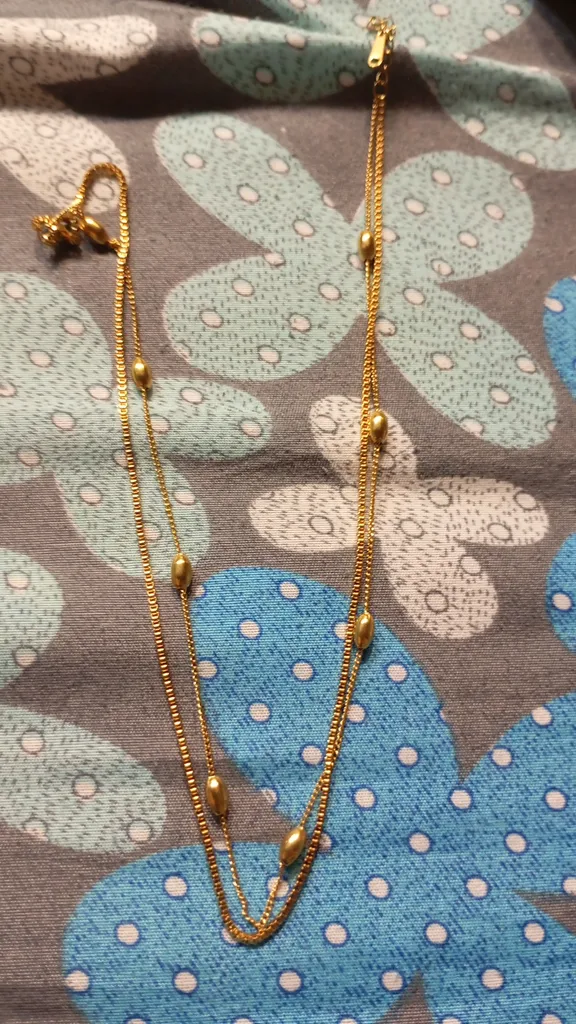 همون چیزی که باید باشه ،خیلی زیبا و دقیقن شبیه به طلا و خیلی تمیز و ظریف ،امیدوارم در بلند مدت رنگش رو از دست نده ،طول زنجیر ۴۵ سانت هست البته بدون زنجیر تنظیم بلندشونده ۴۰ سانت هست