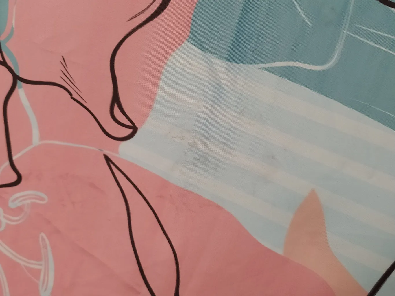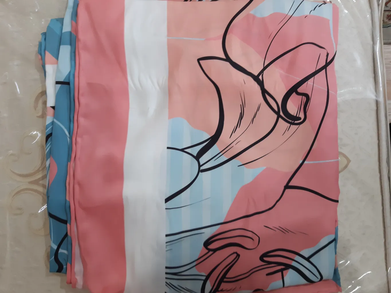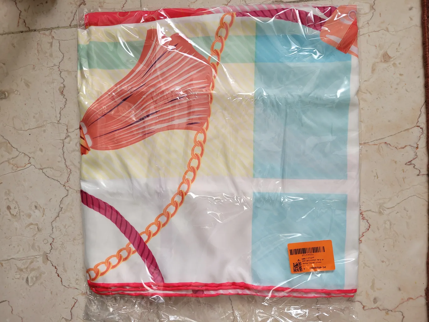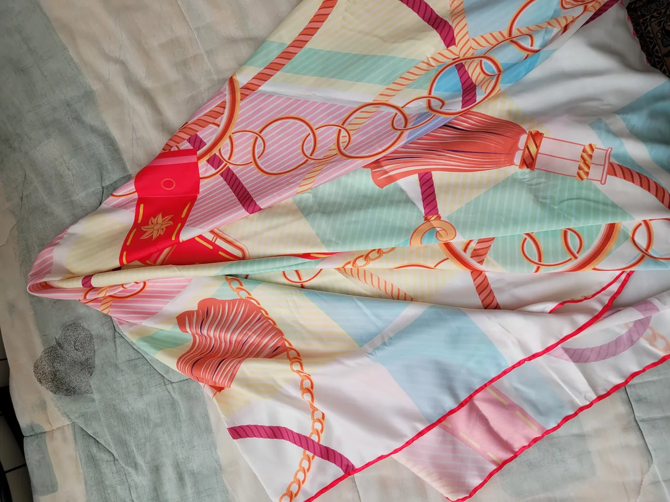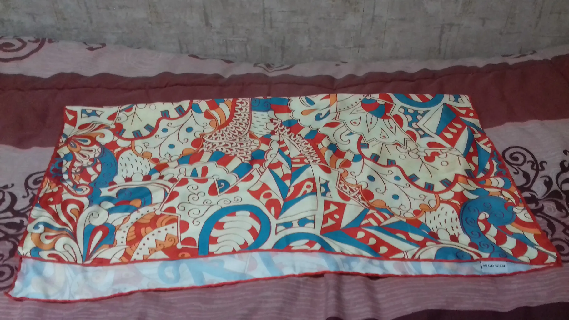 خیلی رنگ و رو رفته ست، انگار چندین بار شسته شده و رنگش کدر یا چرک مرده هست. رنگ منگوله یه آبی بنفش طوری داره که به رنگ و تم کل روسری که چرک مرده ست همخوانی نداره و تو ذوق میزنه . ای کاش با کیفیت تر درستش کرده بودن . وگرنه طرح روسری خیلی زیباست