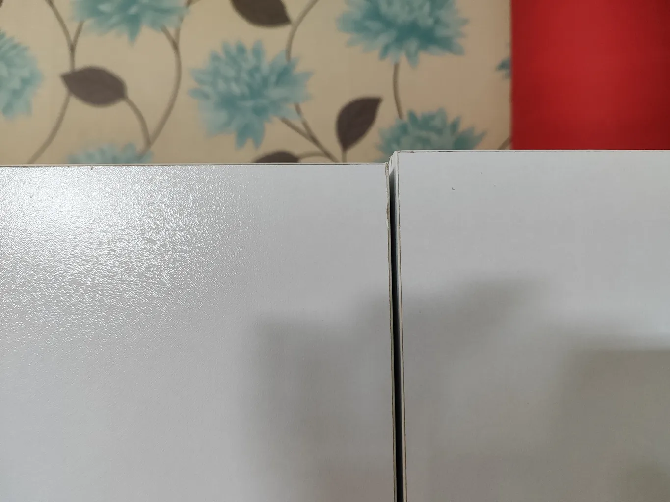 قسمت کشو رو که زدگی داشته رو با رنگ چوب پوشونده بودن که من وقتی خواستم تمیز کنم کمدو این شکلی شد، داخل کمد هم یه خراش عمیق بود که اونم بدین صورت پوشونده بودن، خود کمد خوبه و کاربردی و بسیار سنگین، قسمت رویی انتهایی کمد ورقه نازکه نوپانه که موقع جابجایی باید توجه کنین بهش تا نشکنه، طبقه های کمد استحکام للزم رو داشتن، کشو ها بصورت ریلی هستن، بجز درب ثابت دو درب دیگه آرام بند هستند، مقدار ظرفیت رگال لباس هم خوبه، من این کمد رو با قیمت ۵ میلیون خرید کردم که برا این قیمت مناسب هستش، اگه یه کمد کار راه بنداز موقت میخواید مناسبه، ممنون
