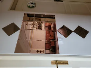 من با کمی تغییر این مشکل رو حل کردم mdf های کوچیک رو با سشوار گرم کردم و از آیینه جدا کردم با بست مناسب دیگری کلا سطح آیینه رو به دیوار مهار کردم که باعث استحکام بیشتر و نصب محکم میشه