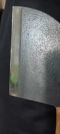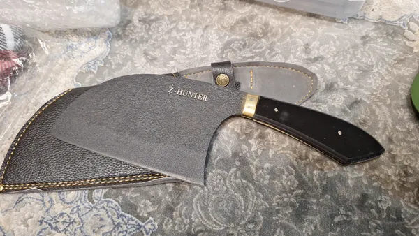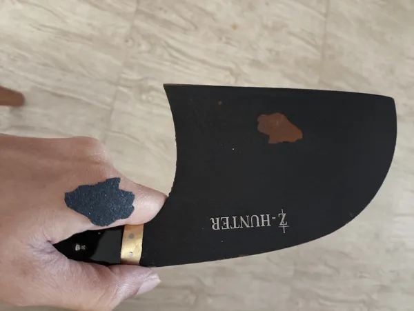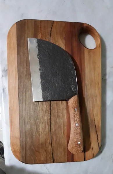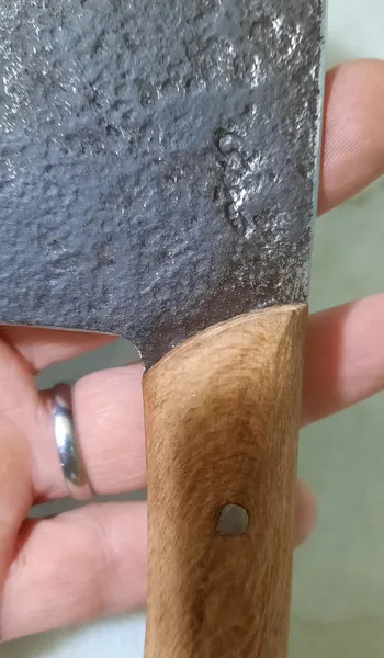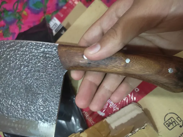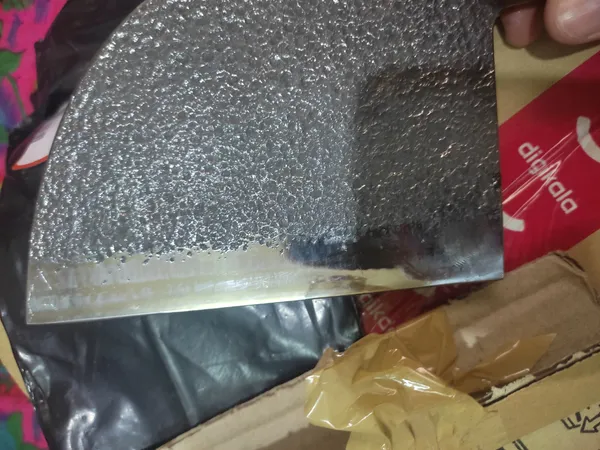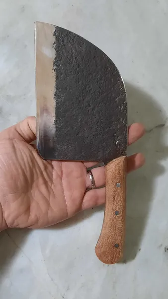 وزنش ۳۲۰ گرمه کلا از جنس آهنه و احتمالا زنگ بزنه باید چرب نگهش داشت. و برای ساطور کاری مناسب نیست اما خوش دست و جذابه. من خوشم اومد ازش. اون قسمت تیزی چاقو براق و بسیار تیزه اما اون قسمت فورج شده (چکش خورده) ی بالای چاقو جنس خود فلز نیست و همه ش رنگه