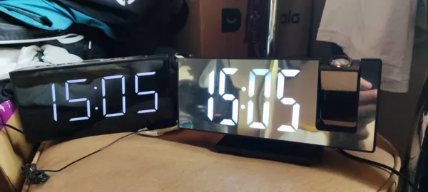 مهم ترین نکته که همه خریدارا باهاش به مشکل برخوردن: نور پروژوکتر که روبه رو میوفته ساعت رو برعکس نشون میده. عزیزان با گرفتن دکمه پروژکتور جهت نمایش ساعت از چپ به راست یا راست به چپ میشه. اما برای کسایی که میخوان بخرن: خیلی کاربردی و خوبه. هم ساعت پروژکتورش در شب نور ایده آل داره و هم صفحه نمایشش بسیار مدرن و خوشگله. برای من نور پروژکتورش مهم بود که بسار واضح و شفافه. در ضمن دما سنج هم داره که دقیقه. خیلی خوبه برای اتاق خواب چون شب دیگه لازم نیس به زور به ساعت های دیواری معمولی نگاه کنی و چیزی هم نبینی. در عکس خودتون مقایسه بکنید تفاوت دو ساعت رو