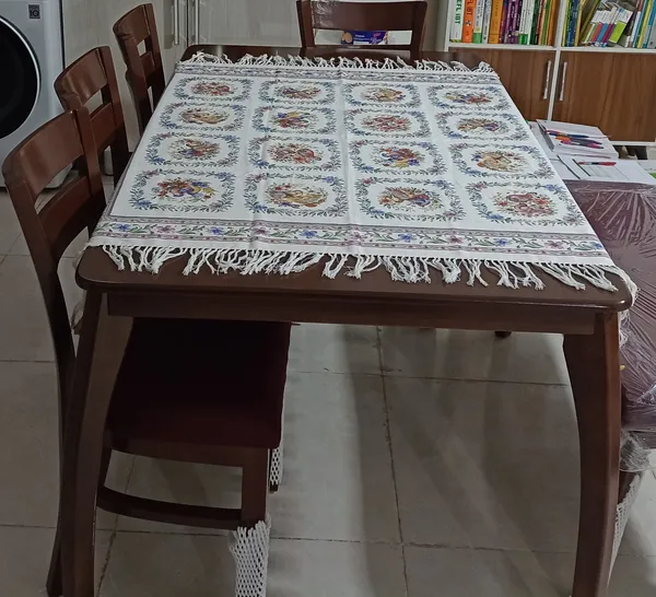 ارتفاع میز در مشخصات درج نشده متاسفانه. طول سطح میز ۱۵۰ سانتیمتر هست. کنار میز پریدگی داشت. روی قسمت بالای یکی از صندلی ها هم شکستگی وجود داشت و رنگ سفید چوب نمایان شده بود. قسمتهای زیرین نرده های صندلی تیز و برنده هستند و سوهان کشیده نشده . در حد همین قیمت ۱۲ و نیم شاید ارزش خرید داشته باشه