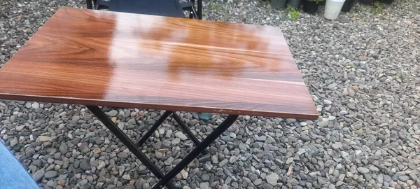 میز چوبی خیلی عالیه محکم و سبک صندلی ها هم نشیمنش فوم داره که عالیه همشون هم کاور دارن