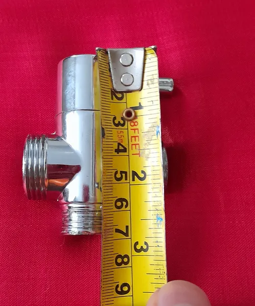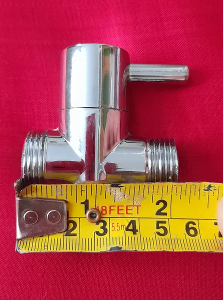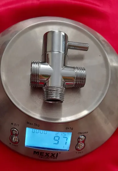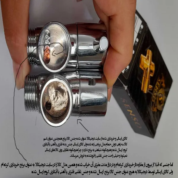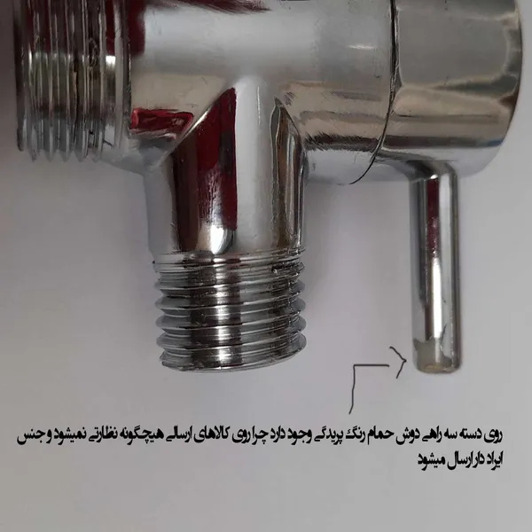 جنس کالا برنج نمی باشد ؛ روی دسته کالا سراهی دوش حمام رنگ پریدگی دارد. در قسمت مشخصات کالا ابعاد کالا 6.5x4.5 و وزن کالا 100گرم و جنس کالا برنج نوشته شده است. ولی کالای ارسالی ابعاد آن 7x5.5 و وزن کالا 97گرم و جنس کالا فلزی یا آهنی با آبکاری کروم می باشد و اصلا جنس آن برنج نمی باشد
