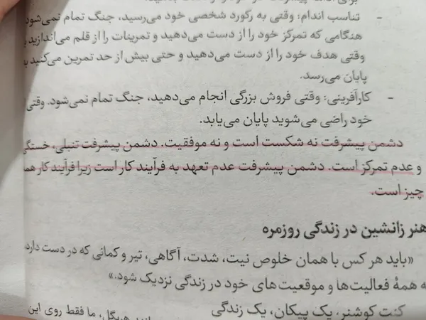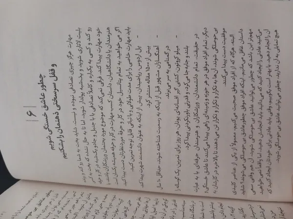 محتواش که درجه یک هست و من خوشم اومد پیشنهاد میکنم تهیه کنید نویسنده سعی کرده همراه راهکار ها و مطالبی که کلا میگه، از انسان های بزرگ مثال بزنه و اینجوری هم برای خواننده جالب هست هم بیشتر تو ذهن میمونه، اما کیفیت چاپ جالب نیست که خب طبیعی هم هست هرچقدر پول بدی همونقدر آش میخوری! صفحات قابل توجهی از کتاب کیفیت چاپ خوبی نداره و کمرنگ هست، دوستاره هم بخاطر همین کم کردم اگه این قضیه براتون مهمه از یه انتشارات دیگه این کتاب رو بگیرید در ضمن قیمت رو اینجا ۳۰۰ تومن زدن، در حالی که قیمت روی جلد ۱۸۸ تومن هست !و من با تخفیف خریدم ۶۰ تومن سالم هم به دستم رسید ، ممنون