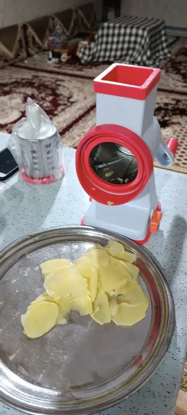 معمولیه رو به خوب ؛ من هر چهار سری شو با سیبزمینی امتحان کردم. ریزترینش له میکنه تا اینکه رنده کنه، درشت تر ها به نسبت بهترن. عکسشو میزارم ببینید. پیازم امتحان کردم با سری دومش، خوب و کامل رنده کرد، چیز خوبیه ولی یه ایراد داره که محکم چفت نمیشه رو سطوح. گیره رو چفت میکنی و بعد از چند دور چرخوندن دستگیرش از جاش در میاد و تکون میخوره . چیزای ترد مثل هویچ و پیازو خیار و این چیزارو خوب رنده میکنه و کار راه بندازه.. خیلی بهتر از رنده دستیه چون همیشه دست منو زخمی میکنه. چیز خوبیه بخرید پشیمون نمیشید