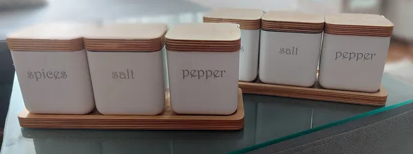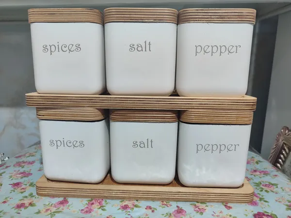 جنس ظرفهای ادویه پلاستیکیه ولی نه پلاستیکی که ناامیدتون کنه، ضخیم و خوبه، خوش فرمه درب ظروف هم راحت باز و بسته میشه و به اندازه کافی ادویه داخلش جا میشه طوری که هر چند ماه یک بار لازم باشه دوباره پرش کنید، اونایی که کم آشپزی می کنن شاید سالی یک بار😉 البته دقت کنید که ظرف ادویه رو پر پر نکنید چون موقع باز کردن درش با مشکل مواجه میشین. صفحه چوبی زیر جاادویه ها چوبیه ولی این چیزی که برای من فرستادن یه کمی کیفیتش کم بود طوریکه پشت صفحه چوبی صاف تر از روش بود. ولی رویهم رفته ست قشنگیه و از خریدم راضیم