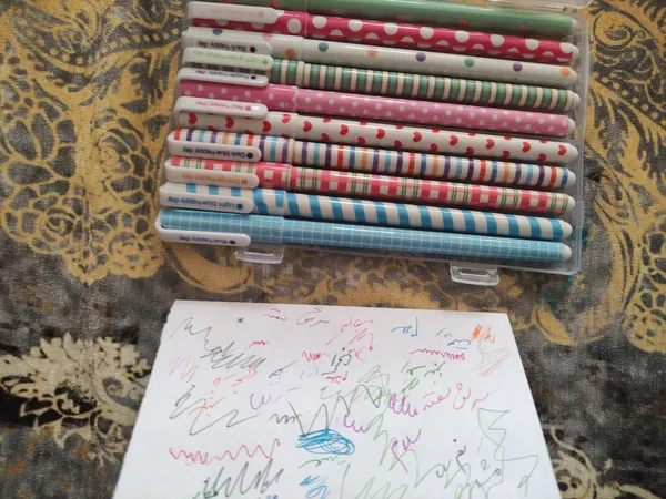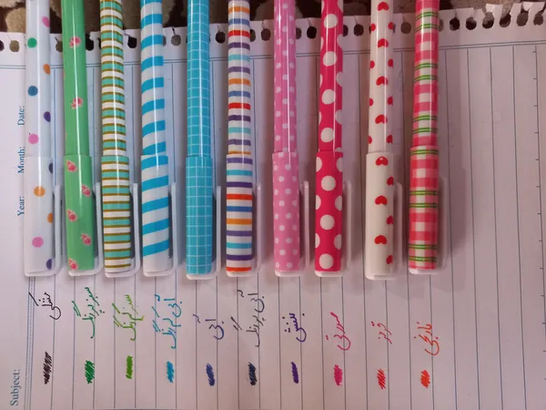خوب بود ؛ از نظر ظاهر دقیقا مثل عکسش هست و خیلی خوشگله و رنگای قشنگیم داره رنگاییم ک داره: بنفش قرمز صورتی نارنجی سبز کمرنگ سبز پررنگ آبی کمرنگ آبی و آبی پررنگ و مشکی بسته بندیش و ظاهرش عالی بود و نوک تیزی هم داره تنها مشکلی که داره اینه که ممکنه وسط نوشتن ی مدت کوتاهی قط بشه و ننویسه ولی طوری نیست که اذیت کنه و کاربردیه درکل