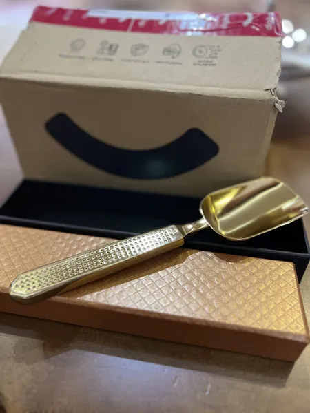 شیک و زیبا ؛ خیلی شیکه. روی دسته اش نگین نداره، یه حفره هایی هست که شبیه نگین دیده می شه از دور. به نظر من این خوبه، چون نگین اگر به مرور زمان بیافته، شکل قاشق رو خراب می کنه. از نظر اندازه هم به نظرم خیلی خوبه. نه خیلی بزرگه و نه خیلی کوچیک. یعنی برای برداشتن آجیل یک میزان ایده آل با سرتاسش برداشته می شه