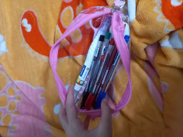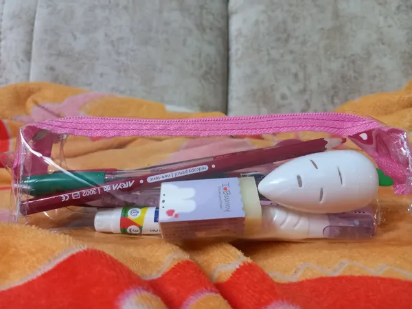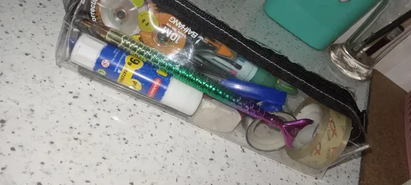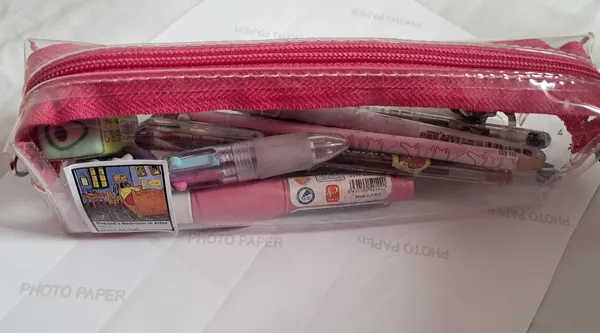 جامدادی شفاف ؛ بزرگتر از حد تصورم بود و خوب این خیلی خوب بود. میتونید بهش استیکر بچسبونید و خودتون تزئینش کنید دوباره هم کنده میشه و جاش نمیمونه من خوشم اومد ولی صورتی فلورسنت یچیزی تو مایه های سرخابیه